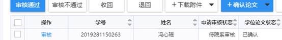 7.最後界麵顯示如下表示成功:待院係審核;學位論文狀態已確認。