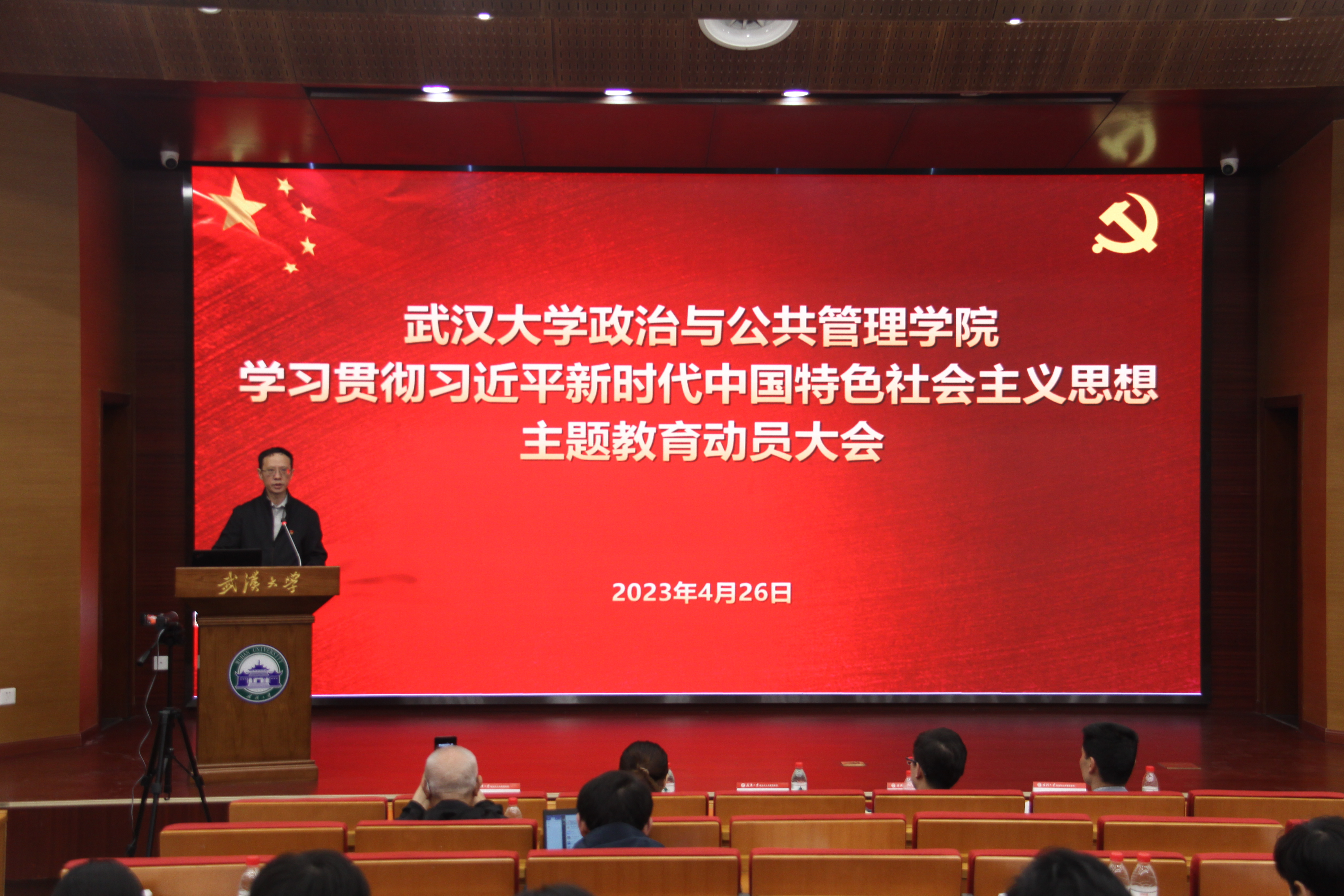 4月26日下午,學院在人文館南廳召開學習(xi) 貫徹習(xi) 近平新時代中國特色社會(hui) 主義(yi) 思想主題教育動員大會(hui) 。黨(dang) 委書(shu) 記梁濤同誌主持會(hui) 議,並作動員講話。武漢大學第二巡回指導組組長、研究生院原副院長丁康同誌作指導講話,指導組副組長、校紀委、監察專(zhuan) 員辦第二紀檢監察室主任趙妍同誌,全體(ti) 院領導、院黨(dang) 委委員,各係主任,各教職工(含離退休)黨(dang) 支部書(shu) 記,研究生黨(dang) 總支、本科生黨(dang) 建委員會(hui) 和部分黨(dang) 員代表參加動員大會(hui) 。