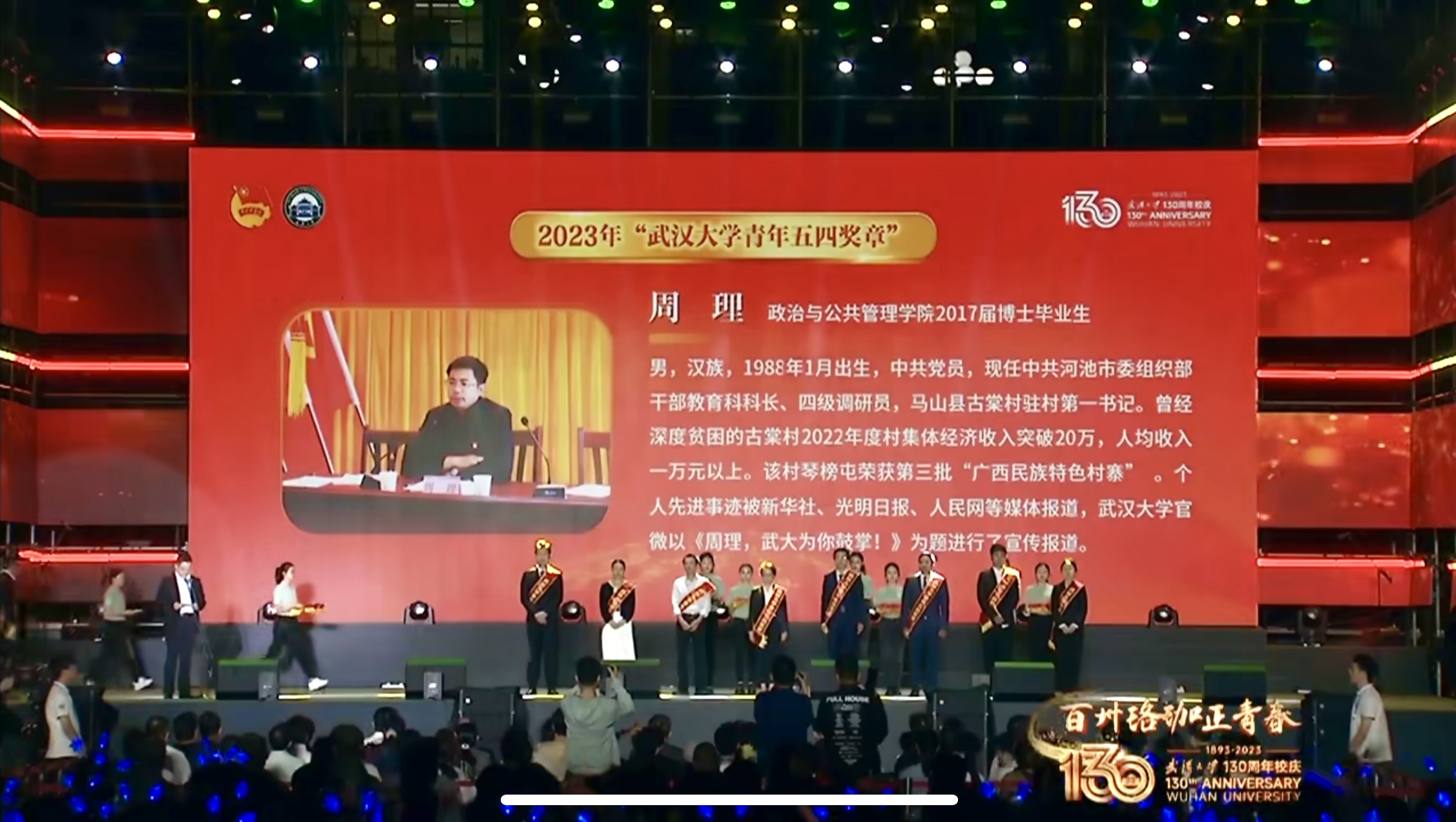 5月5日晚,在武漢大學慶祝130周年慶青春歌會(hui) 上,張平文校長為(wei) 我院2017屆政治學理論專(zhuan) 業(ye) 博士畢業(ye) 生周理院友頒發“武漢大學青年五四獎章”。