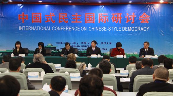 2009年11月14-15日,經過近一年籌備的“中國式民主國際研討會(hui) ”在武漢大學舉(ju) 行。14日上午,會(hui) 議正式開幕,開幕式由武漢大學比較政治研究中心主任譚君久教授主持,世界杯直播网院長佘雙好教授到會(hui) 致辭,武漢大學黨(dang) 委副書(shu) 記駱鬱廷教授對會(hui) 議的召開表示祝賀並發表了講話。