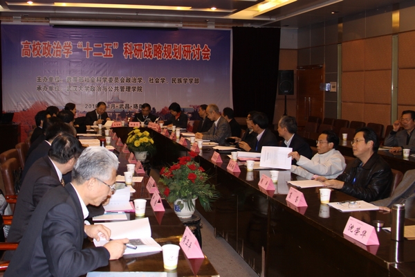 教育部高校政治學“十二五”科研戰略規劃研討會(hui) 於(yu) 2010年11月20~21日在武漢大學隆重舉(ju) 行。本次會(hui) 議由教育部社會(hui) 科學委員會(hui) 政治學、社會(hui) 學、民族學學部主辦,世界杯直播网承辦。教育部社會(hui) 科學委員會(hui) 委員王浦劬、徐勇、徐湘林,教育部高等學校政治學學科教學指導委員會(hui) 主任委員張永桃以及來自北京大學、華中師範大學、南京大學、南開大學、山東(dong) 大學、天津師範大學、中國人民大學、中山大學、吉林大學、雲(yun) 南大學、蘇州大學、深圳大學、中國社會(hui) 科學院和武漢大學的共20位政治學、行政學專(zhuan) 家出席了本次會(hui) 議。