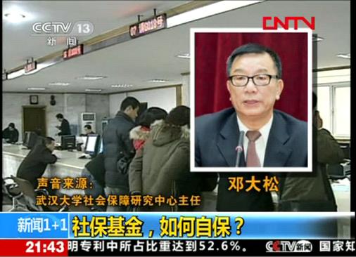 12月21日,武漢大學社會(hui) 保障研究中心主任鄧大鬆教授接受中央電視台“新聞1+1”節目專(zhuan) 訪,就“社保基金,如何自保?”發表了自己的觀點。