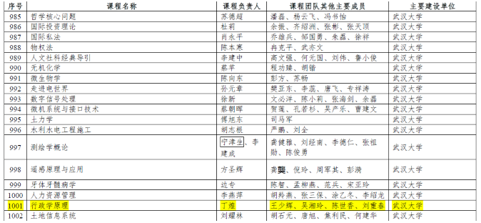 10月30日,教育部網站發布了《關(guan) 於(yu) 首批國家級一流本科課程認定結果的公示》,武漢大學36門課程入選,我院推薦的線下一流課程《行政學原理》課程(負責人:丁煌,主要成員:王少輝、吳湘玲、陳世香、劉重春)成功入選首批國家級一流本科課程。