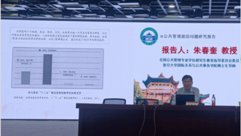 上午典禮結束後,全國公共管理專(zhuan) 業(ye) 學位研究生教育指導委員會(hui) 委員、複旦大學國際關(guan) 係與(yu) 公共事務學院博士生導師朱春奎教授作了題為(wei) 《新中國國家發展規劃體(ti) 係與(yu) 發展規劃回顧與(yu) 前瞻》的研究報告,深入淺出地闡釋了中國政府“集思廣益型”的決(jue) 策模式。
