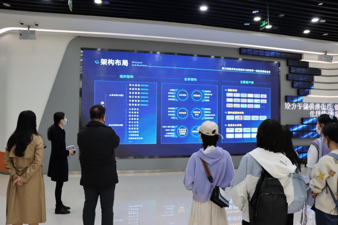 來到烽火通信股份有限公司,同學們(men) 首先在講解員的帶領下參觀了企業(ye) 展廳,了解了烽火通信在光電子、移動通信、網絡信息安全等方麵的專(zhuan) 利獎項與(yu) 創新成果,以及其“最大限度挖掘數字連接價(jia) 值,造福人類社會(hui) ”、全力構築先進技術,不斷貢獻烽火智慧的企業(ye) 文化。作為(wei) 知名央企,烽火通信在基層黨(dang) 建和承當社會(hui) 責任等方麵做的工作也給在場的同學們(men) 留下了深刻的印象。