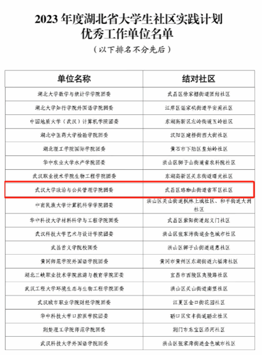 為(wei) 挖掘先進工作典型,持續推動大學生社區實踐計劃走深走實,進一步提升工作實效,2023年9月,團湖北省委下發了《關(guan) 於(yu) 舉(ju) 辦湖北省2023年大學生社區實踐計劃展示活動的通知》,麵向全省高校團學組織廣泛征集優(you) 秀工作案例。經反複審核遴選,我院團委從(cong) 全省78所高校310個(ge) 申報項目中脫穎而出,獲評2023年度湖北省大學生社區實踐計劃優(you) 秀工作單位。