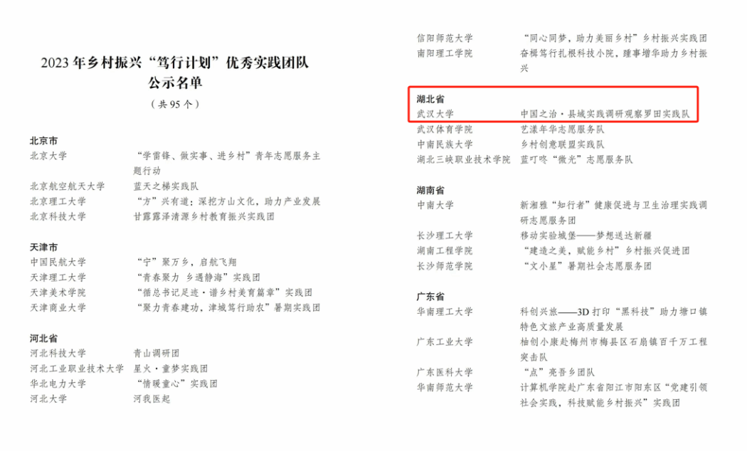 在共青團中央青年發展部公布的2023年全國大中專(zhuan) 學生“三下鄉(xiang) ”社會(hui) 實踐活動之鄉(xiang) 村振興(xing) “篤行計劃”專(zhuan) 項行動獲獎名單中,我院2021級本科生孫遠思作為(wei) 隊長的羅田實踐隊榮獲2023鄉(xiang) 村振興(xing) “篤行計劃”優(you) 秀實踐團隊(學校唯一入選實踐團隊)。