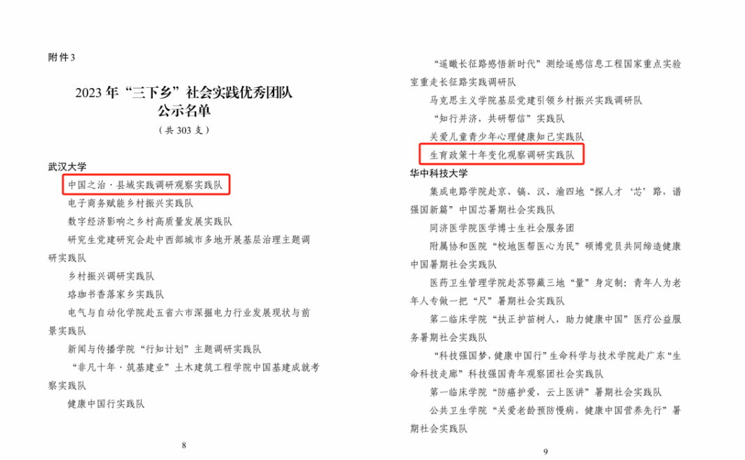 在團省委、省學聯公布的2023年湖北省大中專(zhuan) 學生誌願者暑期文化科技衛生“三下鄉(xiang) ”社會(hui) 實踐活動總結通報結果中,我院2支實踐團隊獲評湖北省2023年“三下鄉(xiang) ”社會(hui) 實踐優(you) 秀團隊(全校15支團隊)。其中,生育政策十年變化觀察調研實踐隊(指導老師:王增文教授、馬雪楊博士後)還獲武漢大學2023年社會(hui) 實踐“揭榜掛帥”項目立項(全校共立項3項)。