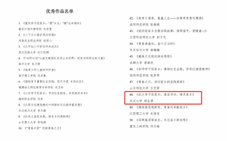 在共青團中央青年發展部、中國青年報社、中國青年網共同舉(ju) 辦的2023年“我的返家鄉(xiang) 實踐故事”征集活動中,我院2021級本科生胡金源等同學提交的作品《武大學子返家鄉(xiang) :基層尋訪,情係家鄉(xiang) 》榮獲“優(you) 秀作品”稱號(學校唯一)。