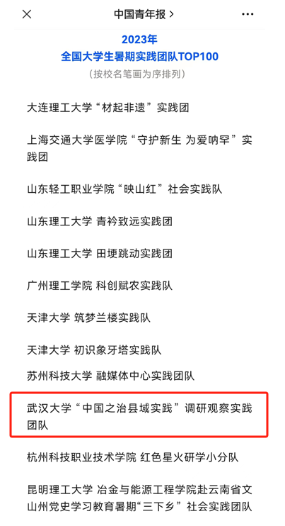 在中國青年報開展的2023年第九屆全國大學生暑期實踐展示活動中,我院“中國之治×縣域實踐”調研觀察實踐團隊獲評2023年全國大學生暑期實踐團隊TOP100(學校唯一入選實踐團隊)。