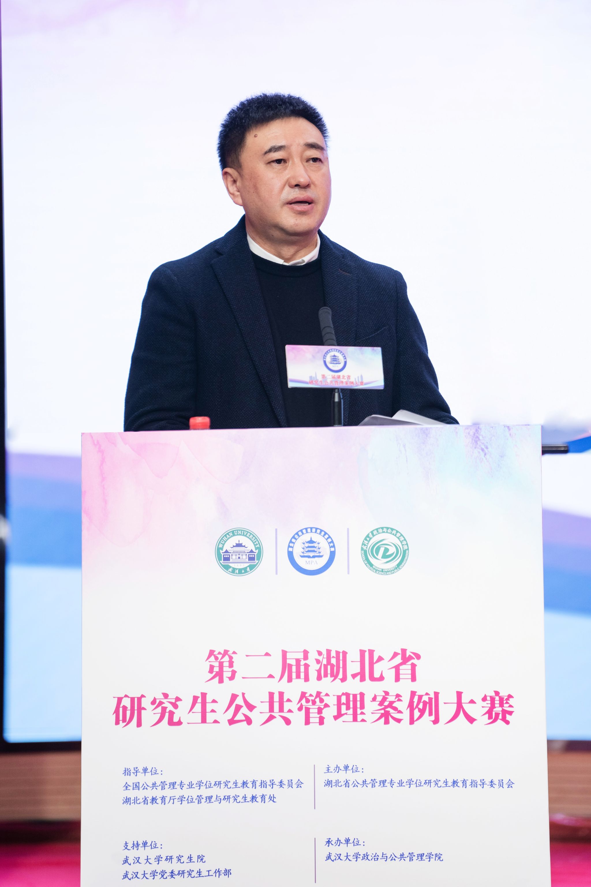 全國MPA教指委秘書(shu) 長、中國人民大學公共管理學院院長嚴(yan) 金明教授代表全國MPA教指委致辭。他首先向湖北省MPA教育取得的優(you) 異成績表示熱烈祝賀,並充分肯定了武漢大學在20餘(yu) 年的MPA教育中所取得的辦學成績。隨後他介紹了案例教學和案例大賽在MPA教育中的關(guan) 鍵作用,呼籲案例大賽和案例教學要積極服務於(yu) 中國自主公共管理知識體(ti) 係的構建。最後,他表達了對參賽選手的希冀,願每一位參賽選手都能收獲滿滿的知識和成長。