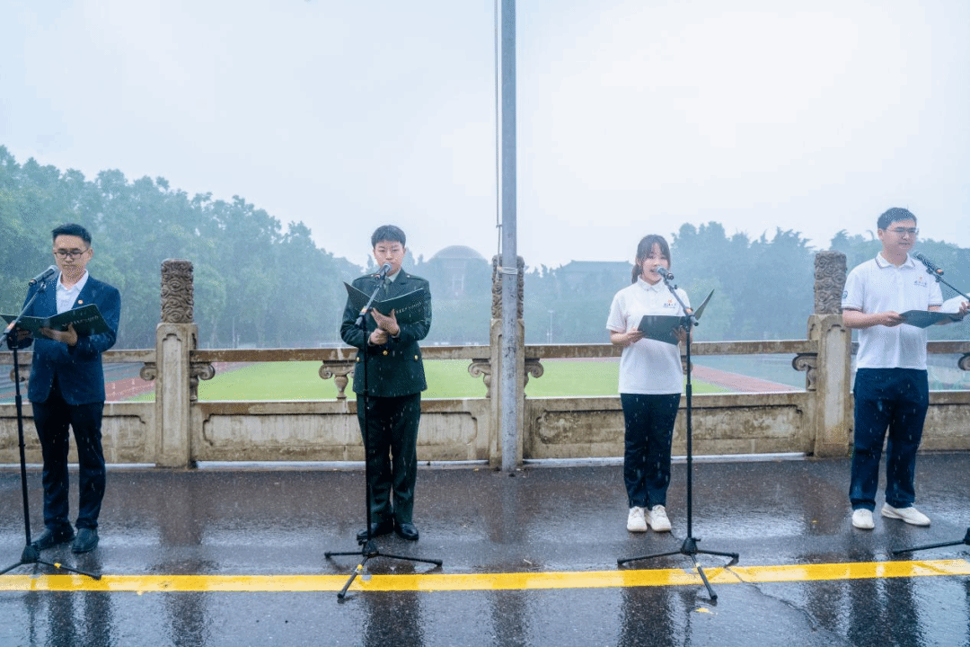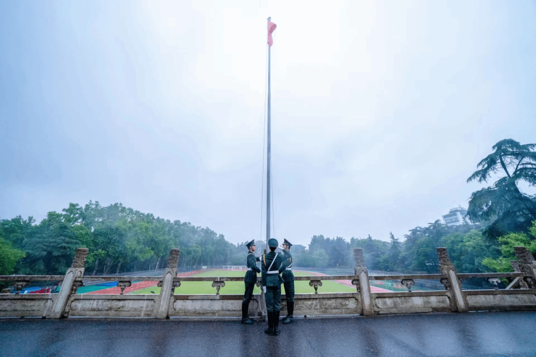 7時整,升旗儀(yi) 式正式開始。國旗護衛隊邁著矯健的步伐,護衛國旗走向升旗台。在淅淅瀝瀝的雨中,在雄壯莊嚴(yan) 的國歌聲中,五星紅旗冉冉升起。國旗護衛隊全體(ti) 隊員向國旗行軍(jun) 禮,在場師生莊嚴(yan) 肅立,麵向國旗行注目禮。