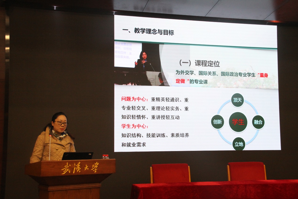 周曉明老師作課程思政項目報告。她以教授的國際法課程為(wei) 例,從(cong) 課程理念與(yu) 目標、教學內(nei) 容創新、教學過程與(yu) 方法創新、考核與(yu) 反饋方式創新、教學創新的效果與(yu) 成績等五個(ge) 方麵分享了其教學創新經驗,得到了大家的一致好評。