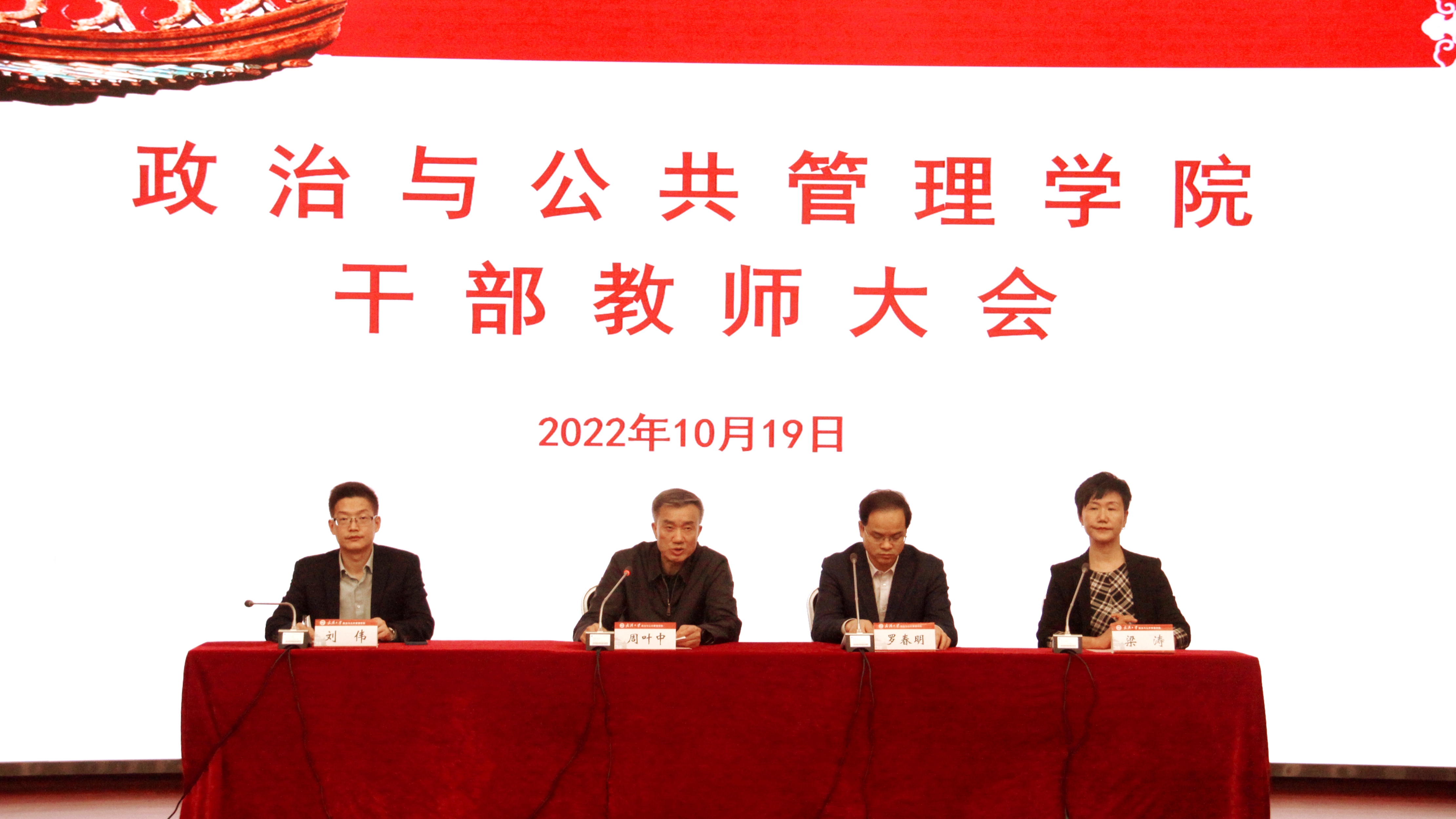 2022年10月19日,學院在南廳召開全體(ti) 幹部教師會(hui) 議。校黨(dang) 委常委、副校長周葉中教授、黨(dang) 委組織部副部長羅春明同誌出席會(hui) 議,會(hui) 議由學院黨(dang) 委書(shu) 記梁濤同誌主持。