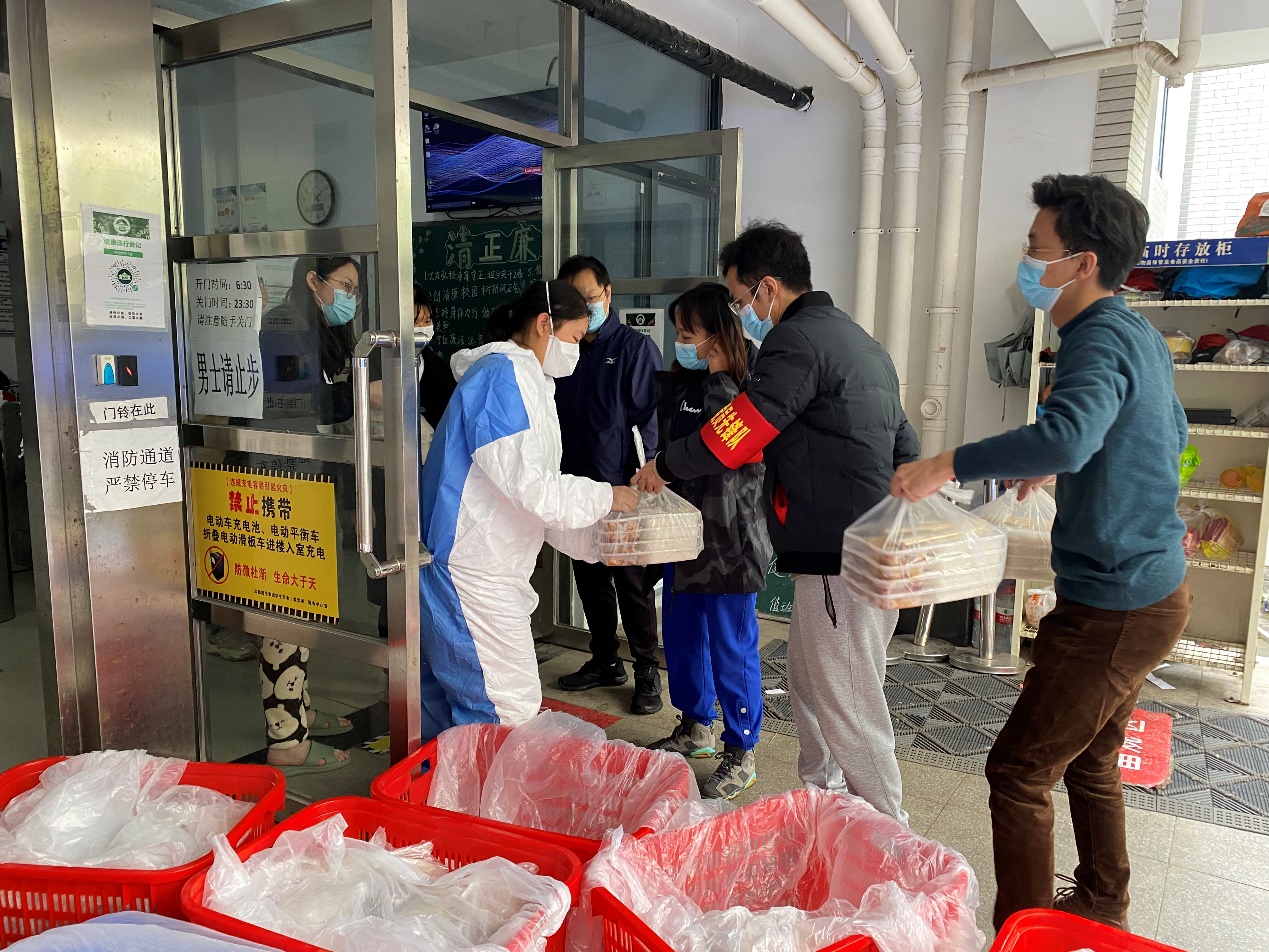 25日早上6點,晨曦微露,全體(ti) 突擊隊員準時到達疫情防控前線—桂園3舍。“同誌們(men) ,我們(men) 包保樓棟學生將近700人,任務十分艱巨,今天是我們(men) 上崗的第一天,希望大家和樓棟長與(yu) 駐樓輔導員密切配合,發揮學院頑強拚搏作風,堅決(jue) 完成包保任務!”在學院黨(dang) 委書(shu) 記梁濤同誌簡短動員之後,大家迅速進入戰位,在駐樓輔導員和樓棟長的安排下分配任務。“請馮(feng) 博、馬棟老師協助樓棟長維持核酸檢測秩序”,“請張亮、林宏、丁金老師負責搬運盒飯,我和梁書(shu) 記負責發放……”。6點50分,同學們(men) 開始陸續排隊下樓進行核酸檢測,“五樓的同學可以下來了…”,“同學,下樓請戴好口罩…”,“做完核酸到這邊領取盒飯…”,所有工作在緊張有序中持續到晚上8點。