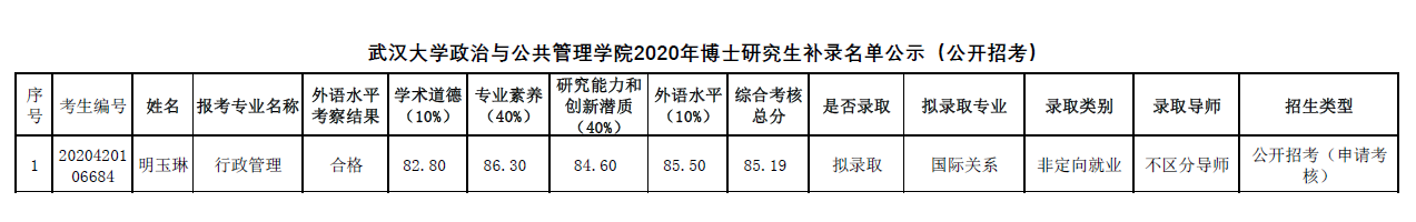 因政治學一級學科內(nei) 合格生源不足,故擬接收院內(nei) 跨一級學科(公共管理學科)的候選人調入申請。按照一級學科內(nei) 綜合考核總評成績由高到低依次遞補錄取的原則,擬補錄公共管理學科未錄取考生中綜合考核總分成績排名第一的考生(姓名和成績見下表)。具體(ti) 信息如下: