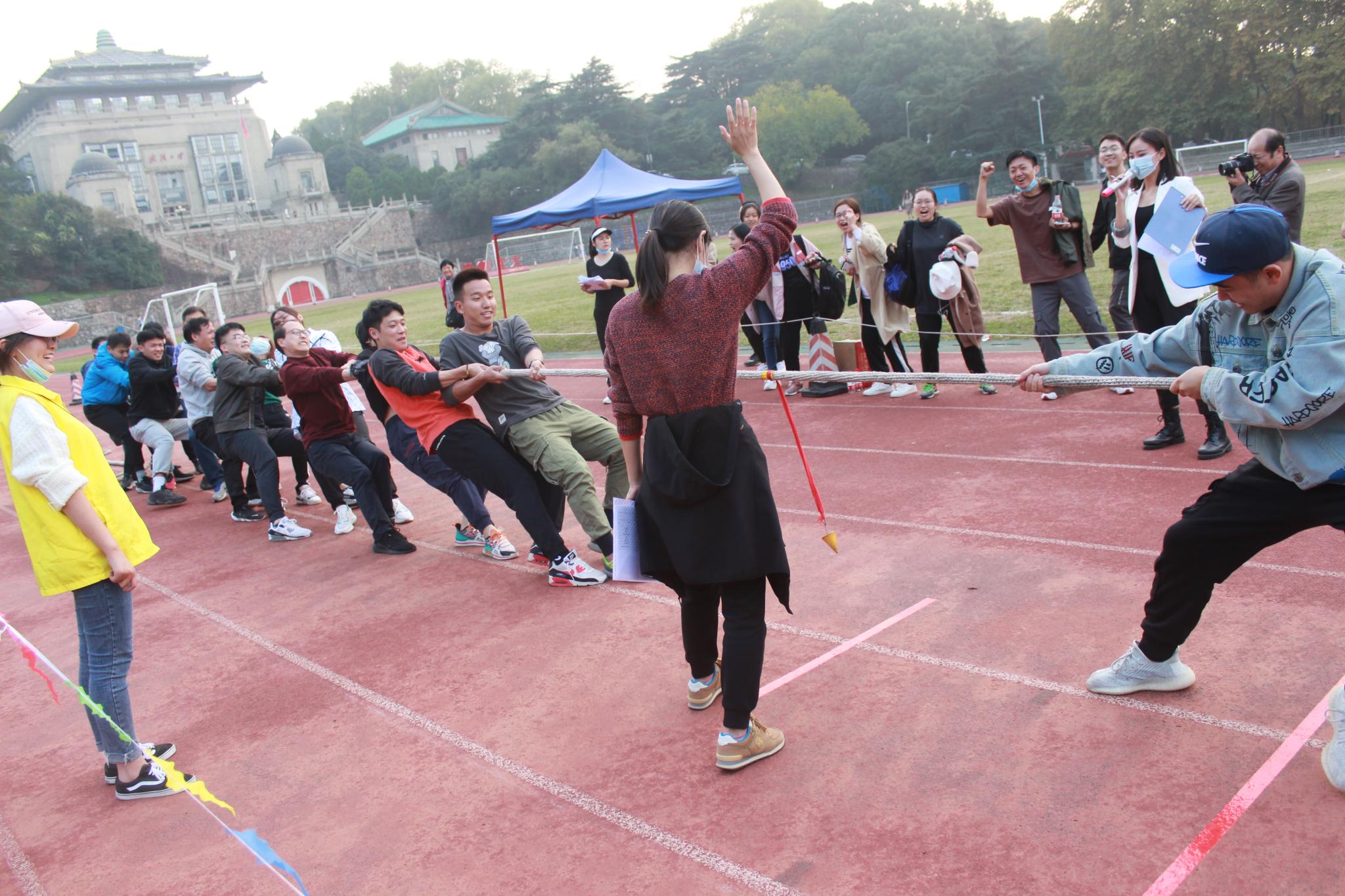 最後進行的是是拔河比賽。作為(wei) 參賽人數最多的比賽,拔河比賽的戰況尤為(wei) 激烈。集體(ti) 的配合,昂揚的鬥誌,皆是取勝關(guan) 鍵。各隊伍都展示出最強的比賽陣容,隨著裁判員一聲令下,參賽的運動員們(men) 緊握長繩,全力以赴。場上“一二、一二”的口號聲與(yu) 加油聲此起彼伏,助威的老師與(yu) 同學們(men) 在道旁高聲歡呼,賽場上氣氛熱烈。最後,“奪冠就”隊取得了拔河比賽的第一名。