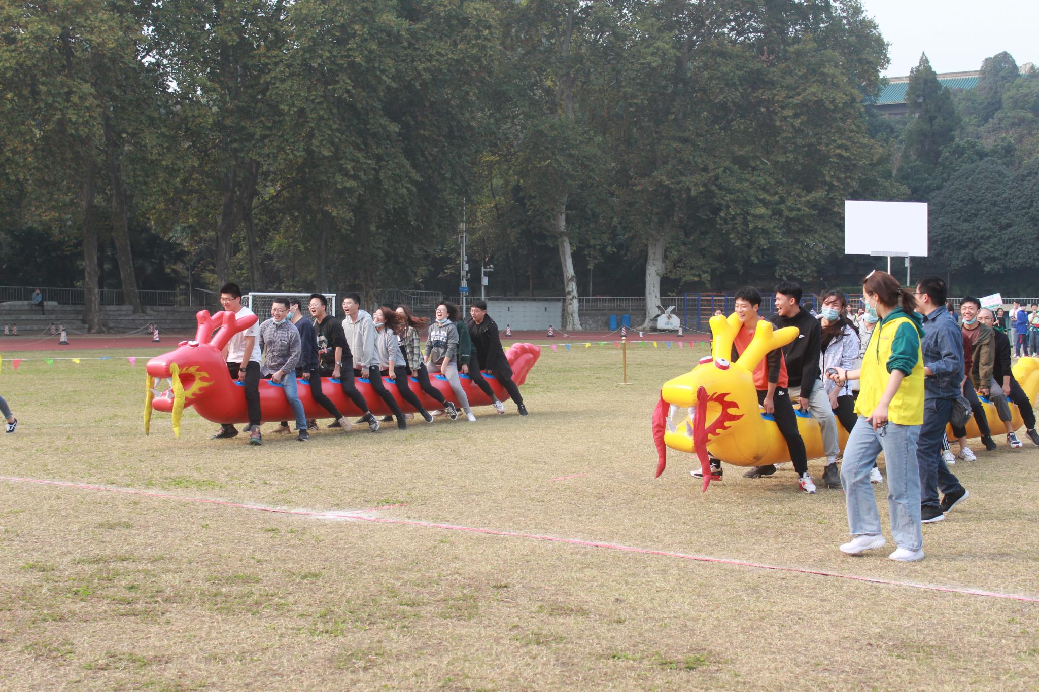 首先進行的是“陸地龍舟”比賽。這項運動需要運動員們(men) 齊心協力,一致行動。裁判發令後,比賽雙方各10名運動員手扶“龍背”,雙腳撐地,騎坐在充氣龍舟上奮力向前。運動員們(men) 口號一致,步伐整齊,場上口號聲與(yu) 加油聲此起彼伏,氣氛十分熱烈。最後“玩的就是心跳”隊以最短的時間完成了比賽,取得了項目第一名。