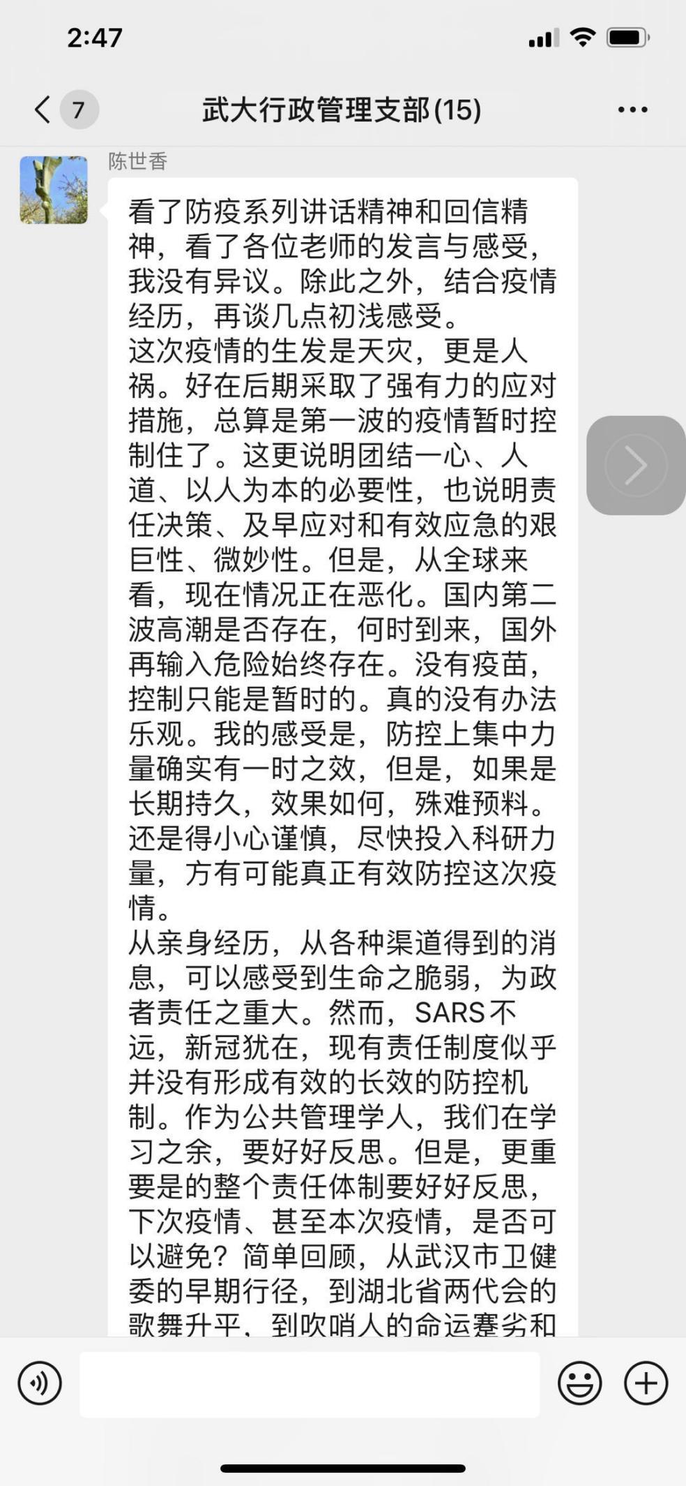 作為(wei) 一個(ge) 黨(dang) 員,不忘初心,就是要做好本職工作。學習(xi) 的目的在於(yu) 成長,學習(xi) 就要有效果,要有針對性,不能泛泛空談,簡單一刀切。現在我們(men) 麵臨(lin) 著係列積壓下來的工作,畢業(ye) 論文指導、畢業(ye) 生工作、研究生複試、網課,都需要有個(ge) 係統的、統一的安排,感覺這種安排還是沒有的,我們(men) 隻好盡力而為(wei) ,積極努力行動起來,問心無悔而已。而在漢、甚至省外、境外的師生的生活、身心健康,恐怕都將是一個(ge) 長期問題。我也希望各位老師相互支持,互幫互助,能夠順利熬過這段時間。