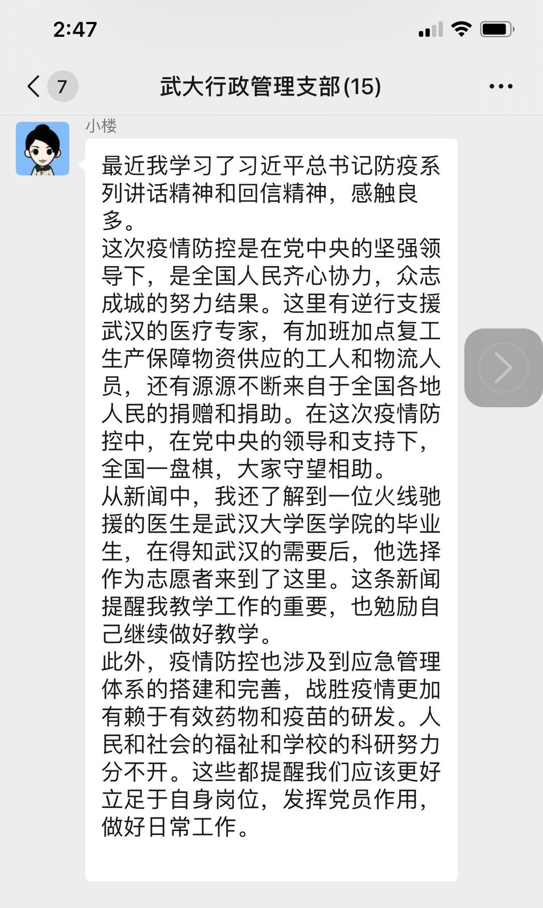 這段時間,在抗擊新冠病毒取得了階段性勝利之時,行管支部組織大家學習(xi) 了總書(shu) 記的有關(guan) 講話精神,作為(wei) 一名親(qin) 曆疫情身在疫區的黨(dang) 員,有幾點感悟與(yu) 反思: