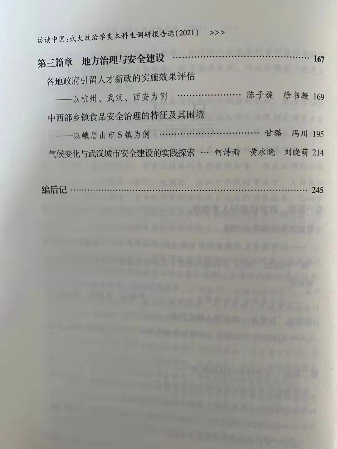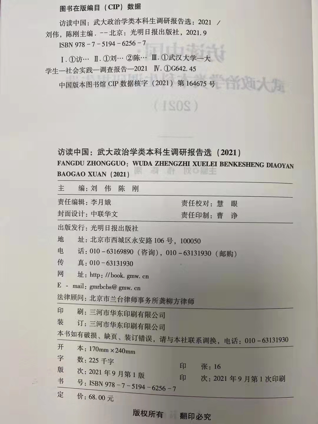 政治學與(yu) 行政學係劉偉(wei) 教授、陳剛副教授主編的《訪讀中國:武大政治學類本科生調研報告選(2021)》已於(yu) 2021年9月由光明日報出版社出版發行。