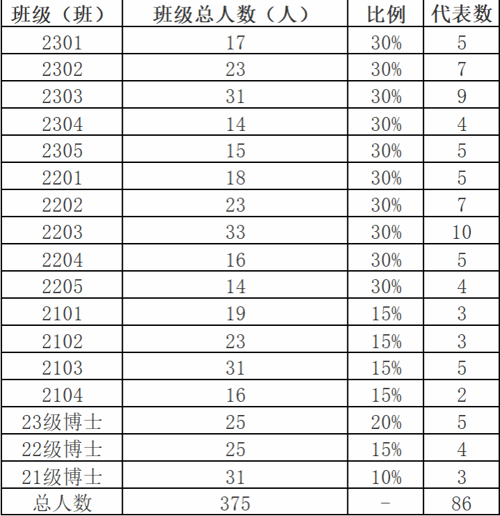 本次研究生代表大會(hui) 代表總名額為(wei) 86人。大會(hui) 籌備委員會(hui) 根據各班級研究生數量和工作需要,對代表名額進行了分配。請各研究生班級根據分配名額,認真做好大會(hui) 代表的選舉(ju) 工作。各班級研究生代表大會(hui) 代表分配名額如下: