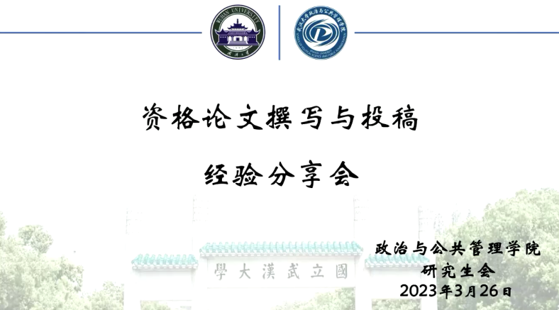 為(wei) 幫助同學們(men) 進一步提高資格論文寫(xie) 作能力,了解期刊投稿流程,3月26日晚19:00,世界杯直播网在線上舉(ju) 行資格論文撰寫(xie) 與(yu) 投稿經驗分享會(hui) 。本次分享會(hui) 邀請吳兵兵、周灝堃、王凱強三位同學作為(wei) 分享嘉賓,由政管院研究生會(hui) “未來學院”學員潘璐主持。