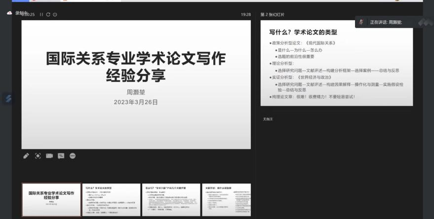 周灝堃同學結合自身專(zhuan) 業(ye) 領域進行學術論文寫(xie) 作經驗分享,對不同學術論文類型的寫(xie) 作思路、論文寫(xie) 作的關(guan) 鍵步驟、文獻評價(jia) 的具體(ti) 方法、不同類型文章的寫(xie) 作過程、論文寫(xie) 作的行文表達等方麵進行了細致介紹,並推薦了相關(guan) 書(shu) 籍。