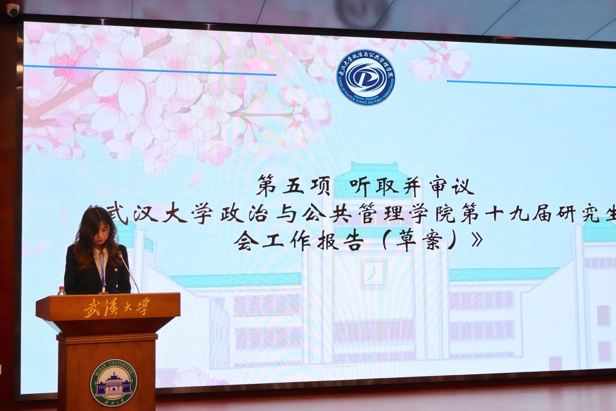 隨後,政管院研究生會(hui) 執行主席王豔蕊代表政管院第十九屆研究生會(hui) ,以《青春“政”好,研途同行》為(wei) 題作工作報告。王豔蕊同學首先帶領大家回顧了我院研會(hui) 一年來在政治引領、組織建設、學術創新、輿論宣傳(chuan) 、生活權益、實踐就業(ye) 、文體(ti) 特色等方麵所做的具體(ti) 工作及實際成效;接著,報告針對在新的曆史機遇下如何應對更大挑戰和更高要求做出了三點建議。最後,王豔蕊同學代表第十九屆研究生會(hui) 對新一屆主席團候選人表達最衷心的期望,勉勵大家挺膺擔當、砥礪奮進,勇踏新征程。