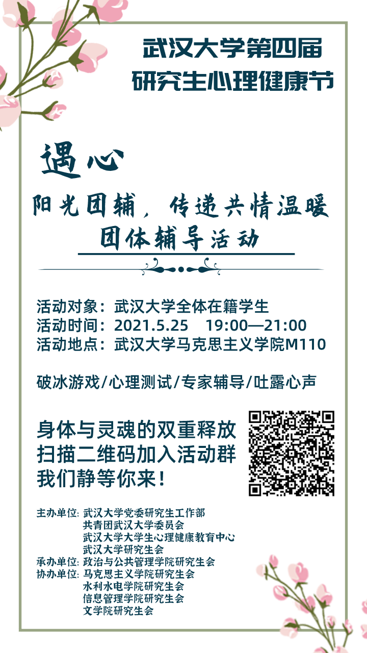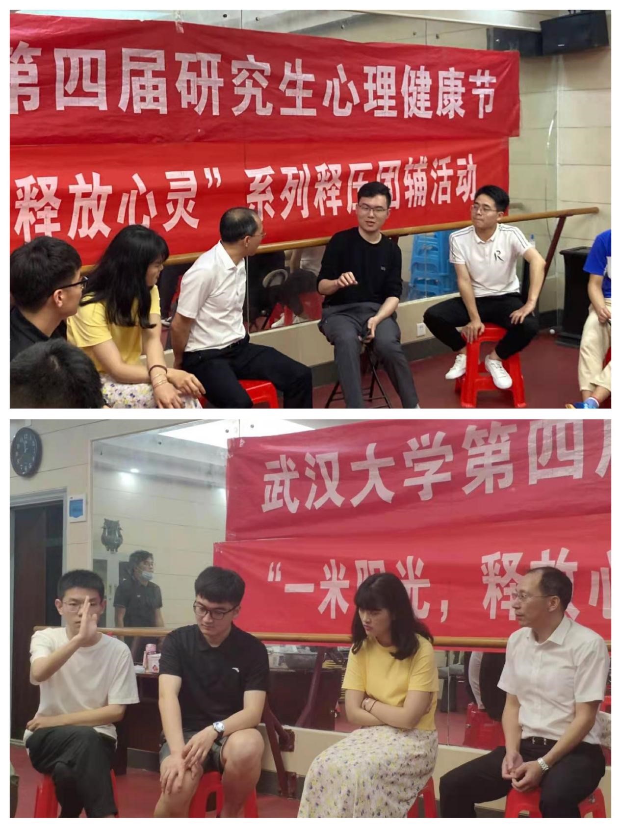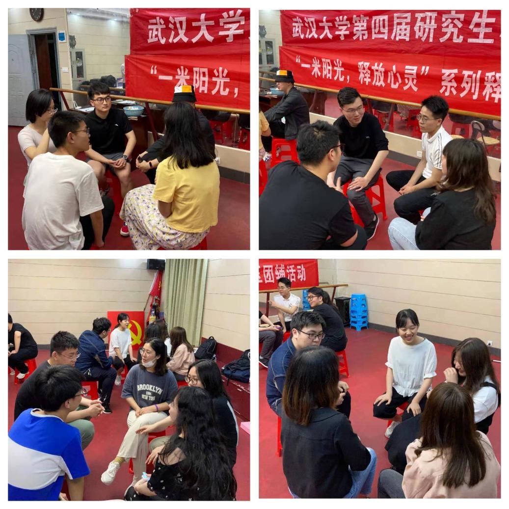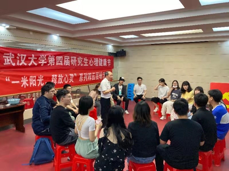 5月25日晚上7:00,武漢大學第四屆研究生心理健康節係列活動之“陽光團輔,傳(chuan) 遞共情溫暖”團體(ti) 輔導活動在馬克思主義(yi) 學院M110教工之家順利舉(ju) 行。此次活動由我院和馬克思主義(yi) 學院聯合舉(ju) 辦,邀請了馬克思主義(yi) 學院張榮華老師進行專(zhuan) 業(ye) 指導,活動以“一米陽光,釋放心靈”為(wei) 主題,旨在通過一係列活動來減輕同學們(men) 的壓力,增強同學心理素質,同時為(wei) 同學們(men) 提供專(zhuan) 業(ye) 輔導,普及心理健康知識,豐(feng) 富同學生活,形成“暖心”氛圍,從(cong) 而促進同學們(men) 心理健康成長、全麵發展。