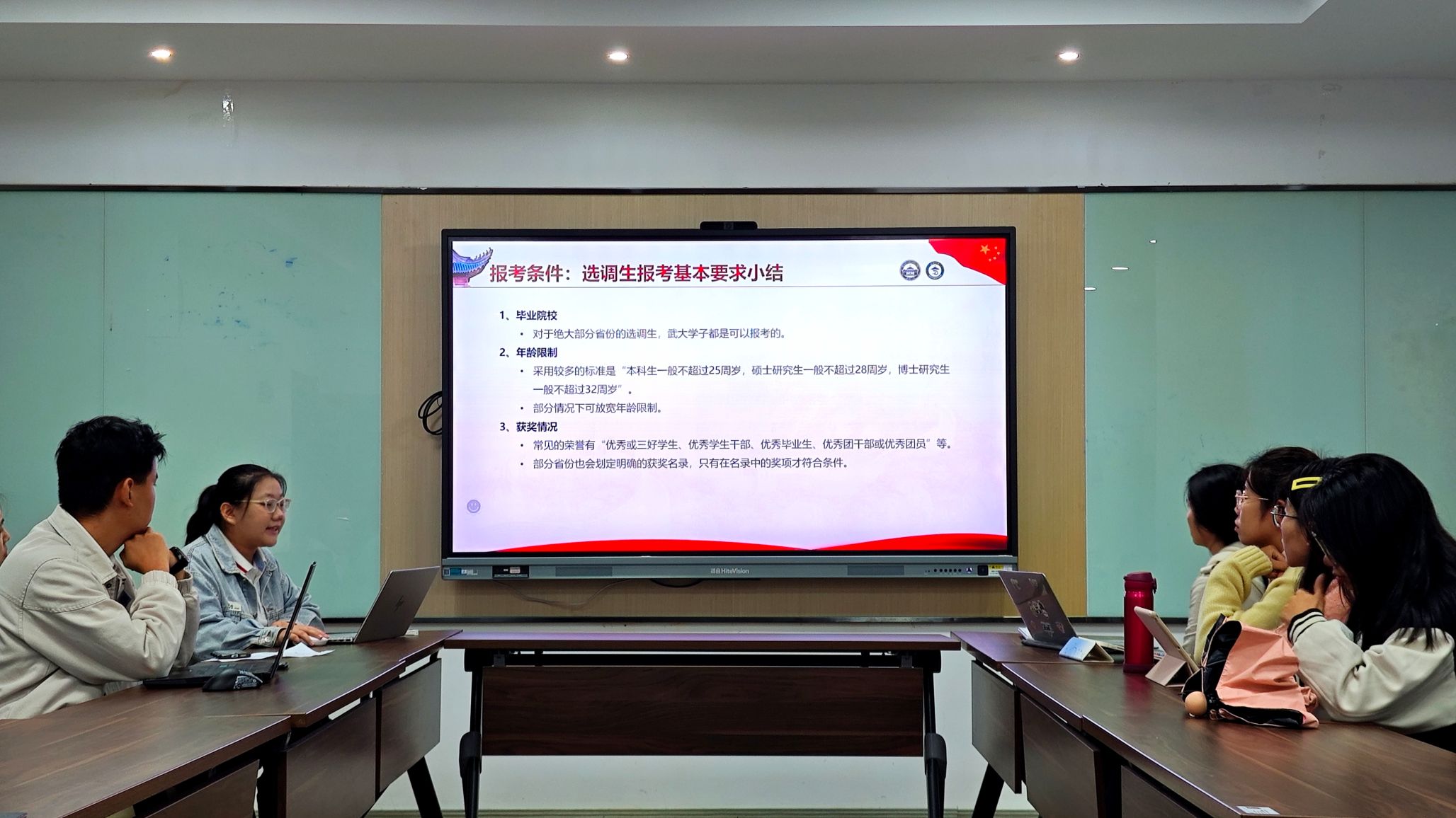 在選調生政策分析中,吳瓊同學介紹了各省選調生政策,分析了武大同學可報考的省份。她提醒大家在閱讀招錄公告時要關(guan) 注報名時間、前置條件等具體(ti) 要求,尤其是要關(guan) 注政策是否存在新的變動。
