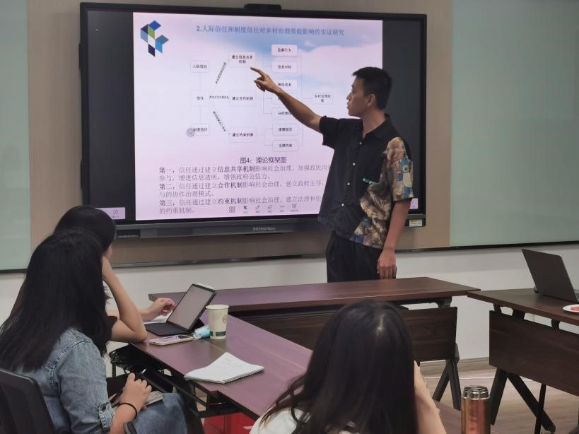 徐雲(yun) 鵬博士的分享主要從(cong) 以下幾個(ge) 方麵展開:1、研究背景和研究意義(yi) ;2、研究現狀;3、研究內(nei) 容;4、研究方案。首先,徐雲(yun) 鵬博士介紹了自己的選題背景,主要從(cong) 城鎮化推進和農(nong) 村社會(hui) 改革使鄉(xiang) 村治理麵臨(lin) 機遇和挑戰、社會(hui) 轉型期間農(nong) 村社會(hui) 信任水平偏低等五個(ge) 方麵展開。其次,在研究現狀部分的講解中,徐雲(yun) 鵬博士先梳理了社會(hui) 治理中的信任分類,又運用信任治理的關(guan) 鍵詞時區演化圖譜和信任治理的關(guan) 鍵詞突現強度排序圖清晰、詳細地介紹了研究熱點和研究趨勢。再次,人際信任和製度信任對鄉(xiang) 村治理效能影響的案例研究、人際信任和製度信任對鄉(xiang) 村治理效能影響的實證研究兩(liang) 大方麵構成了徐雲(yun) 鵬博士此研究的重點內(nei) 容。最後,徐雲(yun) 鵬博士簡單介紹了研究方法,包括案例研究和定量研究,最終形成技術路線圖。演講過程中,徐雲(yun) 鵬博士幽默地講述了自己在寧夏回族自治區的調研經曆和訪談過程,最終克服訪談中遇到的困難形成了二十萬(wan) 字的訪談稿,現場氛圍非常愉快、融洽。