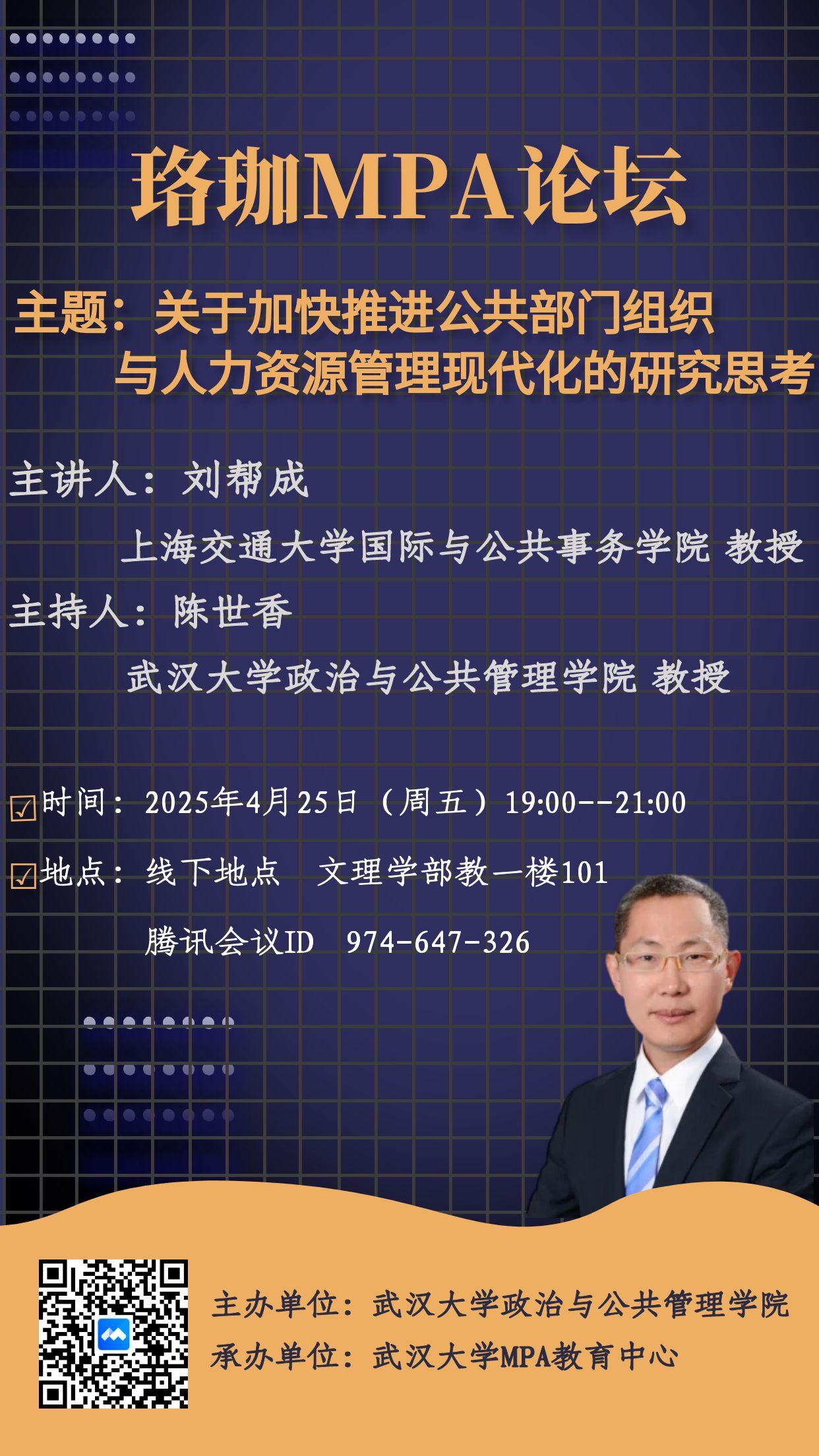 【講座預告】珞珈MPA論壇 | 關於加快推進公共部門組織與人力資源管理現代化的研究思考-世界杯直播网