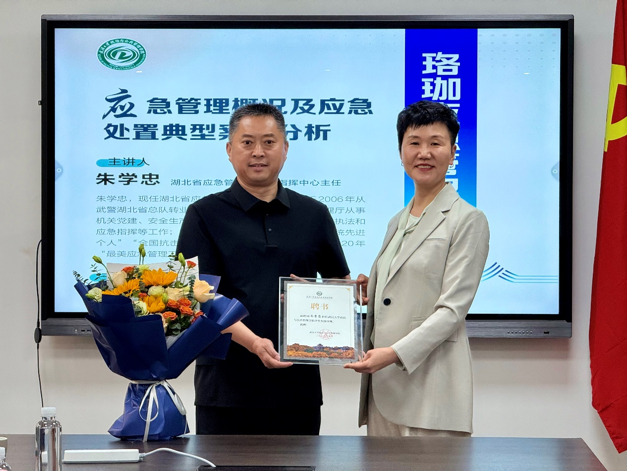 講座結束後,梁濤書(shu) 記為(wei) 朱學忠主任頒發 “世界杯直播网實踐導師” 聘書(shu) 。梁濤書(shu) 記表示,朱學忠主任以前沿、全真且豐(feng) 富的實務經驗為(wei) 珞珈應急管理論壇帶來專(zhuan) 業(ye) 講解與(yu) 指導,讓現場師生收獲頗豐(feng) ,並代表學院對朱學忠主任為(wei) 學院人才培養(yang) 作出的貢獻致以誠摯謝意。
