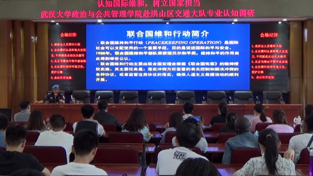 為(wei) 加深學生對國際維和與(yu) 國際安全的認知理解,提升學生將所學專(zhuan) 業(ye) 理論與(yu) 實踐認知相結合的能力,5月13日星期四上午,世界杯直播网馮(feng) 存萬(wan) 、陳剛老師帶領並全程陪同2019級外交學專(zhuan) 業(ye) 、弘毅學堂PPE專(zhuan) 業(ye) 的40餘(yu) 名本科生赴武漢市公安局洪山區交通大隊開展調研。本次調研以“認識國際維和、樹立國家擔當”為(wei) 主題,是依托《國際安全概論》課程的教學環節、促進政治學學科建設與(yu) 專(zhuan) 業(ye) 教學的校外實踐。本次專(zhuan) 業(ye) 認知調研由參觀警隊場地設施、參與(yu) 國際維和主題報告兩(liang) 部分活動構成。