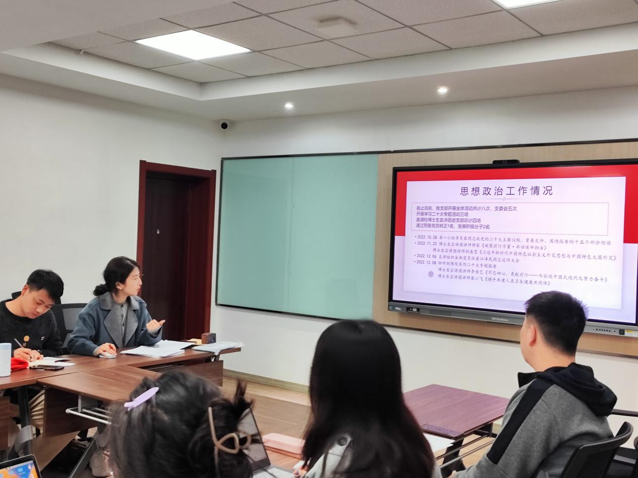 會(hui) 議第二項,支部書(shu) 記李靜宜同誌代表支部委員會(hui) 就2022年度支部重點工作進行匯報。李靜宜同誌從(cong) “支部建設情況及成效”、“思想政治工作情況”、“支部建設存在問題”、“未來工作思路”四個(ge) 方麵代表支部委員會(hui) 進行了報告。支部自9月27日成立以來有條不紊地按照《中國共產(chan) 黨(dang) 章程》《中國共產(chan) 黨(dang) 組織工作條例》等要求,抓好支部建設、嚴(yan) 格落實選舉(ju) 工作、規範開展組織生活、按時交納黨(dang) 費。切實做到強化政治引領,通過支委帶頭講黨(dang) 課,積極組織主題學習(xi) 報告會(hui) ,夯實黨(dang) 員教育;堅持黨(dang) 建賦能,結合博士生特點,邀請校博士生宣講團交流,拓寬學術眼界,把質量作為(wei) 博士黨(dang) 員發展生命線,力爭(zheng) “把科研尖兵發展為(wei) 黨(dang) 員、把黨(dang) 員培育為(wei) 科研尖兵”。支部創新黨(dang) 小組學習(xi) 模式,我支部黨(dang) 員共18名,分成6個(ge) 小組,上學期已有三個(ge) 小組組織主題黨(dang) 日,效果良好,未來將繼續注重提升“三會(hui) 一課”質量,緊貼支部黨(dang) 員實際需求,以黨(dang) 建賦能促發展。此外團支部積極發揮作用,通過全員完成每周青年大學習(xi) 及組織主題團課,營造我支部良好學習(xi) 風氣。最後,李靜宜同誌就支委會(hui) 針對查擺不足情況,深刻剖析原因,結合全國組織部長會(hui) 議部署2023年基層黨(dang) 建工作重點任務匯報我支部委員會(hui) 下一步整改措施。