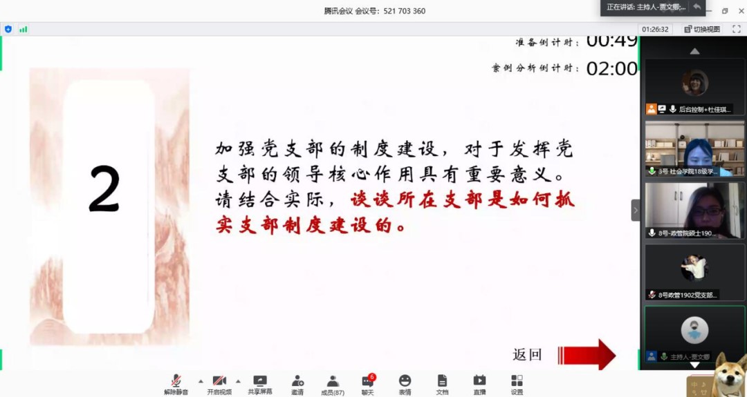 第一環節隨著所有支部的展示完畢順利結束,大賽進入了第二環節——案例分析,各參賽黨(dang) 支部現場抽取選題,由黨(dang) 支部書(shu) 記或支委成員展開進行分析。我院碩士1902黨(dang) 支部推選黨(dang) 支書(shu) 孫靜竹同學參與(yu) 環節競賽,其抽取的題目為(wei) “支部製度建設”,孫靜竹同誌從(cong) 政治製度、紀律製度、監督製度、組織製度維度進行了分析闡釋,指出支部建設並非一日之功,需在實踐中不摸索、踐行。