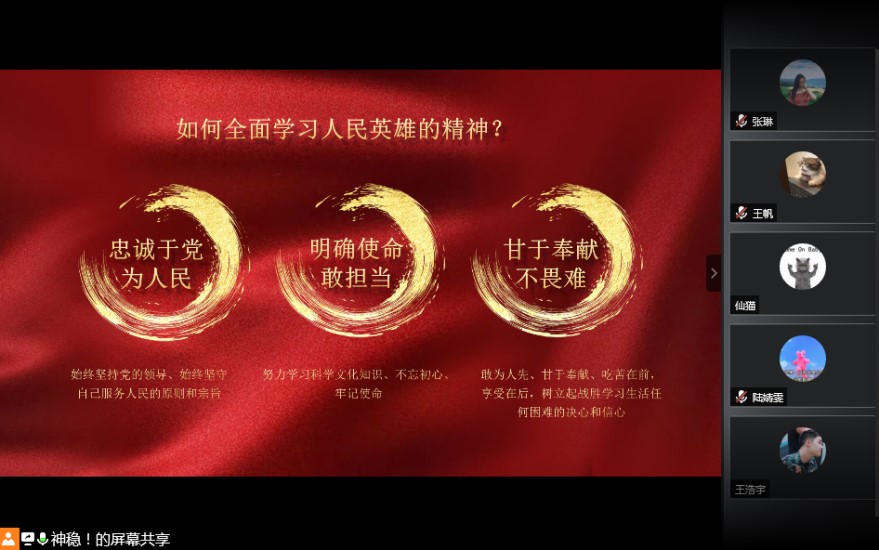 活動伊始,全體(ti) 研會(hui) 成員一起感悟人民英雄故事。2020年8月,習(xi) 近平總書(shu) 記批準通過表彰在抗擊新冠肺炎疫情的人民英雄鍾南山、張伯禮、張定宇和陳薇。首先,全員一起回顧了共和國勳章的獲得者鍾南山院士的事跡,鍾南山院士以84歲的高齡繼續奮戰在抗疫一線以及敢為(wei) 人先的精神讓人敬佩不已。其次,在回顧張伯禮院士的英雄故事中,我們(men) 感受到他不計得失的家國情懷;再次,在感悟張定宇的英雄事跡中,其身患漸凍症仍然隻想著新冠肺炎疫情患者的救治的忘我精神著實令人感動;在人民英雄陳薇將軍(jun) 的身上,科研報國、保衛人民的無私精神讓我們(men) 心生敬佩。英雄們(men) 的事跡把愛國、忠誠、奉獻、擔當、奮鬥的精神體(ti) 現得淋漓盡致,英雄們(men) 把他們(men) 的大愛播撒在祖國大地,播撒進每個(ge) 中國人的心中,更深深震撼著正在學習(xi) 中的研會(hui) 成員們(men) ,學習(xi) 並實踐英雄的家國情懷和精神,勢在必行。