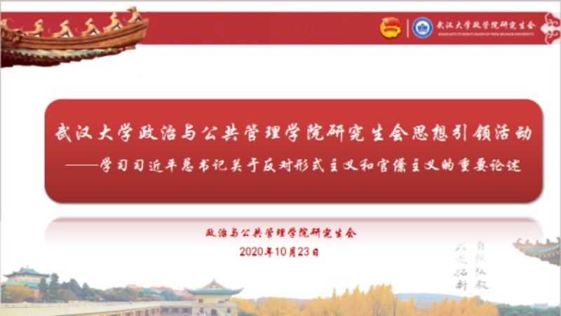 2020年10月23日下午,世界杯直播网研究生會(hui) 全體(ti) 成員於(yu) 學院216會(hui) 議室開展了一次富有意義(yi) 的理論學習(xi) 活動,本次活動以“反對形式主義(yi) 和官僚主義(yi) ”為(wei) 主題,深入領悟學習(xi) 習(xi) 近平總書(shu) 記關(guan) 於(yu) 反對形式主義(yi) 和官僚主義(yi) 的重要論述。本次活動由研會(hui) 秘書(shu) 處成員李欣玥同學主持,政管院研究生會(hui) 全體(ti) 成員積極參與(yu) 、並進行了深入的討論。