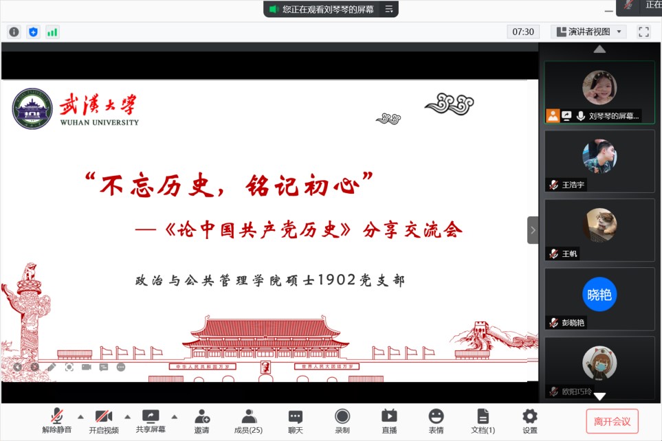 為(wei) 切實推動黨(dang) 史學習(xi) 教育走深走實,激發同學們(men) 的學習(xi) 黨(dang) 史的熱情,更好地做到學史明理、學史增信、學史崇德、學史力行,政管院碩士1902黨(dang) 支部於(yu) 5月22日14:00通過騰訊會(hui) 議開展《論中國共產(chan) 黨(dang) 曆史》線上分享交流會(hui) 。