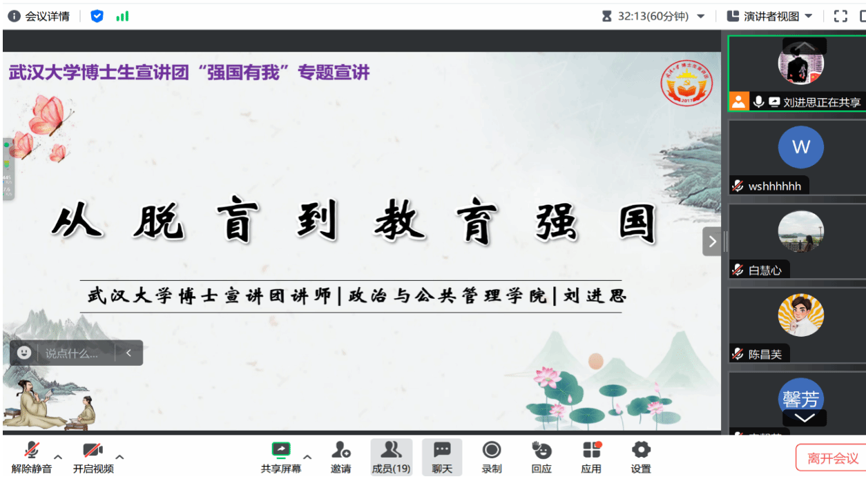 為(wei) 響應學習(xi) 貫徹全國兩(liang) 會(hui) 精神,2024年4月26日19:00,2026年世界杯时间赛程直播2022級博士生黨(dang) 支部開展線上主題黨(dang) 日活動。本次學習(xi) 活動由支部學“習(xi) ”小組第二組組織承辦,由武漢大學博士宣講團講師李馨芳和劉進思帶領大家進行專(zhuan) 題學習(xi) 。本次會(hui) 議由支部副書(shu) 記劉進思同誌主持。