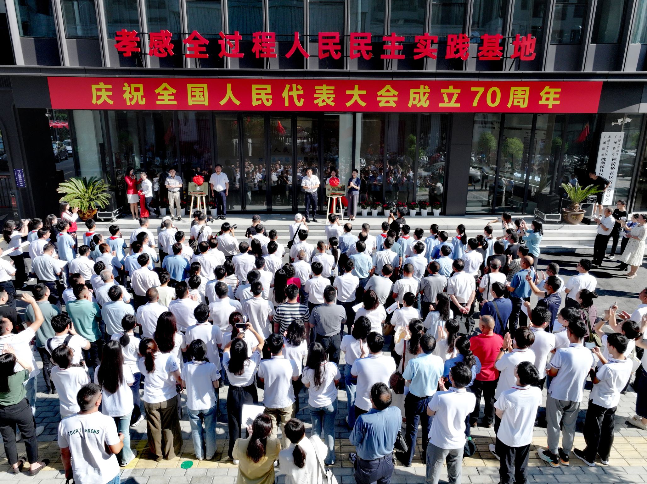 為(wei) 深入學習(xi) 貫徹習(xi) 近平總書(shu) 記關(guan) 於(yu) 堅持和完善人民代表大會(hui) 製度的重要思想和在慶祝全國人民代表大會(hui) 成立70周年大會(hui) 上的重要講話精神,進一步積極探索實踐育人的新路徑,拓寬高素質人才培養(yang) 的廣闊舞台,2024年9月29日上午,學院全過程人民民主實踐孝感基地正式揭牌,師生一行還參與(yu) 了慶祝全國人民代表大會(hui) 成立70周年活動。孝感市人大常委會(hui) 黨(dang) 組副書(shu) 記、副主任李先喬(qiao) ,世界杯直播网院長劉偉(wei) 、黨(dang) 委副書(shu) 記李欣、陳剛老師、樓笛晴老師、馮(feng) 川老師、朱海英老師,孝感市人大常委、政府、黨(dang) 校、政協等各部門領導,以及我院30餘(yu) 名學生代表參加活動。