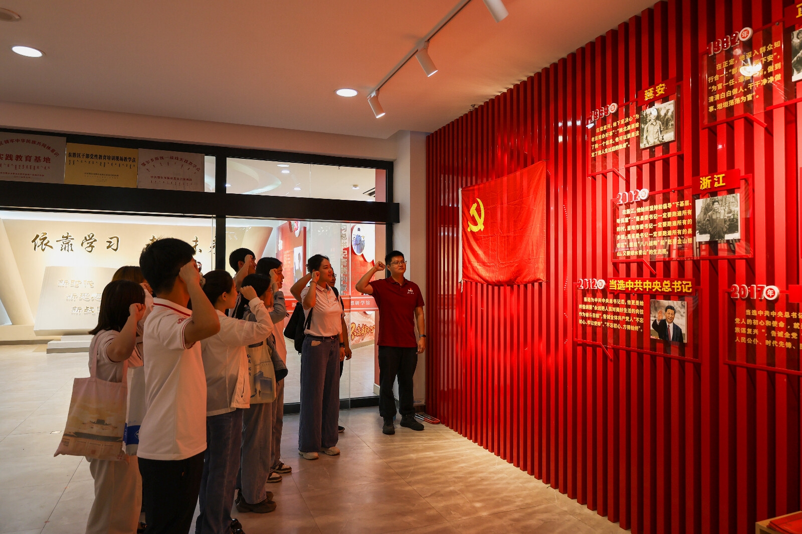誓言錚錚,初心灼灼。在鄂爾多斯市東(dong) 勝區鑄牢中華民族共同體(ti) 意識實踐教育展覽館,助研團臨(lin) 時黨(dang) 支部的13名研究生黨(dang) 員站在黨(dang) 旗下重溫入黨(dang) 誓詞,在領誓人的帶領下舉(ju) 起右拳共同宣誓,恪守信仰,不忘初心。