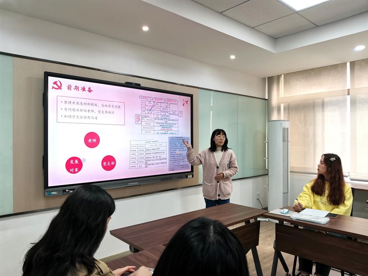 本科生黨(dang) 建工作委員會(hui) 主任李清源對入黨(dang) 流程及相關(guan) 材料的撰寫(xie) 規範進行了分享,並提出前期預審、集中講解、後期審核、即時溝通四個(ge) 環節的工作要求。此外,她表示在發展黨(dang) 員的過程中黨(dang) 支部應當與(yu) 團支部密切聯係,及時梳理時間截點,總結常見問題,注意材料填寫(xie) 的完整、正確、規範和個(ge) 性。她清晰的講解讓與(yu) 會(hui) 成員對入黨(dang) 流程以及入黨(dang) 材料的規範撰寫(xie) 有了更為(wei) 深入的了解。