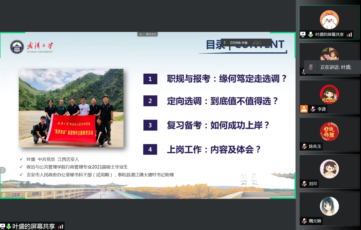 葉盛師兄全方位分享了個(ge) 人考取選調的經曆以及目前基層工作的心得體(ti) 會(hui) 。師兄指出,成為(wei) 選調生是一種將青春寫(xie) 在祖國大地上的選擇,作為(wei) 政管學子,我們(men) 在進行職業(ye) 選擇時,應該將個(ge) 人前途與(yu) 祖國命運緊密相連。隨後,師兄分享了考取選調的經驗,並建議同學們(men) 應該堅持學業(ye) 為(wei) 本,築牢知識根基;積極投身實踐,促進本領提升;參與(yu) 體(ti) 育鍛煉,強身健體(ti) 礪誌。