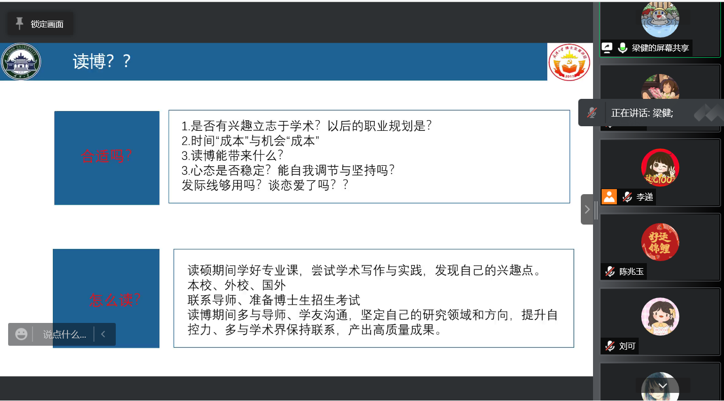 梁健師兄以自身讀博經曆開篇,告誡同學們(men) 讀博前應該先想好自己是否適合走學術道路,在確定讀博意向後,要在學好專(zhuan) 業(ye) 課的同時,嚐試學術寫(xie) 作和實踐,發現學術興(xing) 趣點,確定研究方向。在攻讀博士階段,“揚長避短”是一個(ge) 技巧,多與(yu) 導師討論是一種習(xi) 慣,多產(chan) 出是一種要求,保持好的心態是一種必備的品質。同時,梁健師兄結合自己曾經考選調的經曆,也分享了部分備考和考試技巧。