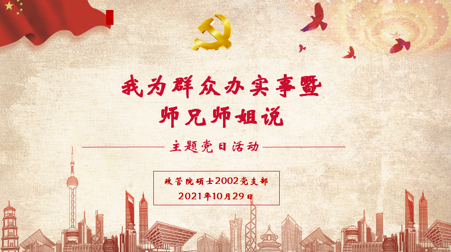 為(wei) 認真學習(xi) 貫徹習(xi) 近平總書(shu) 記在黨(dang) 史學習(xi) 教育動員大會(hui) 上提出的將學習(xi) 黨(dang) 史同總結經驗、觀照現實、推動工作結合起來,同解決(jue) 實際問題結合起來,開展好“我為(wei) 群眾(zhong) 辦實事”實踐活動的精神,碩士2002黨(dang) 支部特舉(ju) 辦本次主題黨(dang) 日活動。經過前期調研,支部了解到許多同學在未來人生道路的選擇上陷入了比較迷茫的狀態。10月29日,支部邀請學院2020級行政管理專(zhuan) 業(ye) 博士研究生梁健師兄、2018級行政管理專(zhuan) 業(ye) 碩士研究生葉盛師兄和周鵬程師姐,分享攻讀博士、考取選調、企業(ye) 求職的經驗和心得。本次活動由碩士2002黨(dang) 支部書(shu) 記李遞主持。