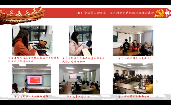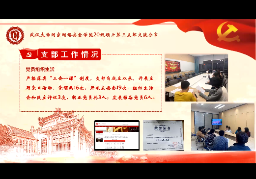 隨後,國家網絡安全學院的兩(liang) 個(ge) 黨(dang) 支部代表也進行了分享。碩士2003黨(dang) 支部書(shu) 記武金路就黨(dang) 員教育與(yu) 學習(xi) 、特色主題黨(dang) 日活動的開展進行了經驗分享。其支部舉(ju) 行了形式多樣的學習(xi) 活動,且黨(dang) 課由支部黨(dang) 員輪流講授,達到共同學習(xi) 、共同提高,變黨(dang) 員“被動學”為(wei) “主動學”,營造了良好的學習(xi) 氛圍;在開展特色主題黨(dang) 日上,結合專(zhuan) 業(ye) 特色,廣泛開展網絡安全知識科普活動,充分發揮支部黨(dang) 員先鋒模範作用以及國家網絡安全基地在東(dong) 西湖臨(lin) 空港的輻射作用。碩士2101黨(dang) 支部書(shu) 記彭雲(yun) 璐就監督理論學習(xi) ,主題黨(dang) 日的參與(yu) ,以及支部內(nei) 建活動展開分享。在監督理論學習(xi) 方麵,其著重介紹了一係列製度化規定,包括學習(xi) 強國積分製、均勻劃分黨(dang) 小組,加強黨(dang) 員同誌對發展對象與(yu) 積極分子的引導作用與(yu) 培養(yang) 考察,以小組為(wei) 單位開展組織生活會(hui) 以及主題黨(dang) 日輪流製度;在進行主題黨(dang) 日以及支部內(nei) 建活動的開展時,強調與(yu) 其他支部之間的共建與(yu) 合作,還有借助學院平台開展活動。