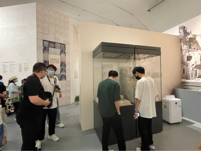 一進入展廳,映入眼簾的是身長15.8米的臥佛,釋迦臥側(ce) ,超然塵世,大家頓時感受到“寂滅為(wei) 樂(le) ”的涅槃境界,並為(wei) 之感慨。拾級而上,穿梭千年思路,感受不同朝代絲(si) 路麵孔,此時此刻曆史不再是冷冰冰的文字,生動地展現於(yu) 眼前,令人沉醉其中。接著參觀各個(ge) 複刻洞窟、佛像以及近百件珍貴文物,一件件都帶領我們(men) 感受著最生動的曆史,最真實的過去。