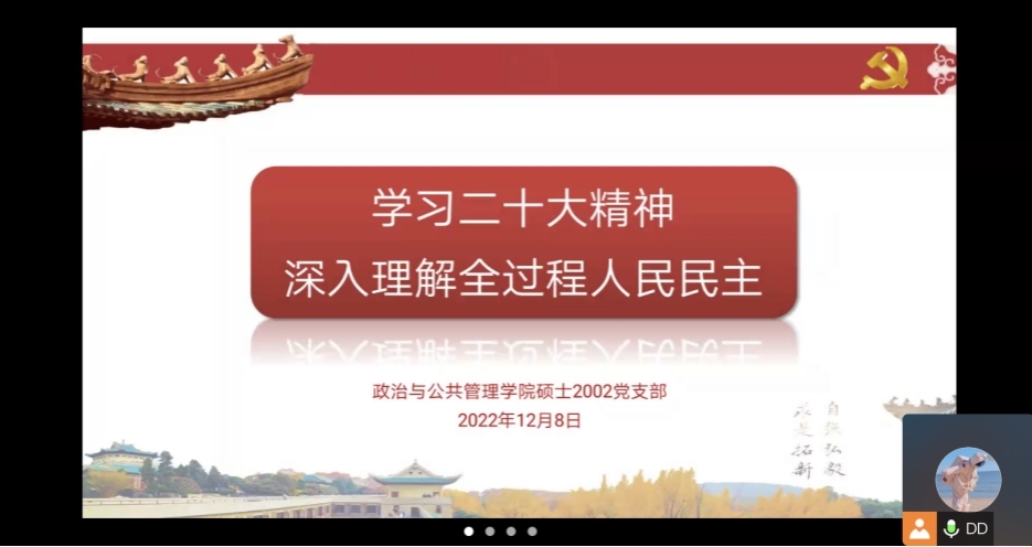 碩士2002黨(dang) 支部的黨(dang) 員結合專(zhuan) 業(ye) 學習(xi) 和自身經曆,分享了對全過程人民民主的理論與(yu) 實踐及其在中國特色社會(hui) 主義(yi) 建設中發揮的重要作用的理解。張立菲、楊昕煜等幾位黨(dang) 員從(cong) 全過程人民民主的價(jia) 值導向出發,分享了其對於(yu) 全過程人民民主的“人民性”的理解:全過程人民民主根植於(yu) 人民,體(ti) 現人民的意誌、保障人民的權益、回應人民的需要,激發人民的創造力,是人民當家作主的製度保障。王萌婷、蔡孟霏、孟祥等從(cong) 西式自由主義(yi) 民主與(yu) 全過程人民民主的對比的角度出發,認為(wei) 西式民主隻有在選舉(ju) 時喚醒民眾(zhong) 的民主意識,極易出現選舉(ju) 時候選人信誓旦旦,選舉(ju) 後承諾變成一紙空文的荒唐現象;而全過程人民民主立足於(yu) 中國國情,衝(chong) 破西方中心主義(yi) 曆史觀的枷鎖,超越西式民主,為(wei) 世界民主形式貢獻中國經驗。鮑子欣和李夢雨分別從(cong) 愛國統一戰線和經驗研究與(yu) 理論構建的結合闡述她們(men) 的理解。通過這次主題學習(xi) ,碩士2002黨(dang) 支部各位黨(dang) 員對黨(dang) 的二十大精神有了更深入的認識,從(cong) 自身專(zhuan) 業(ye) 和實踐的角度解讀了全過程人民民主,並通過學習(xi) 更加明確了黨(dang) 員的責任和義(yi) 務,決(jue) 心為(wei) 中國特色社會(hui) 主義(yi) 政治發展努力奮鬥。